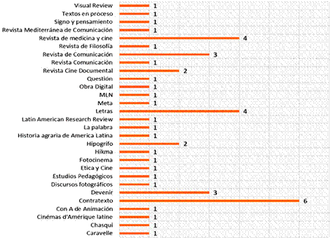 La publicación que acoge el mayor número de registros es Contratexto (13.04%, n=6), seguida por la Revista de Medicina y Cine (8.7%, n=4), Letras (8.7, n=4), la Revista de Comunicación (6.52%, n=3), Devenir (6.52%, n=3), la Revista de Cine Documental (4.35%, n=2) e Hipogrifo (4.35%, n=2). Todas las demás revistas de la muestra tienen la cantidad mínima de registros (n=1) (ver Figura 5).