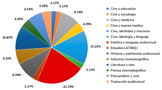 Así, se tiene una mayoría evidente de trabajos que abordan ‘Estética y lenguaje audiovisual’ como principal campo de indagación (21.74%), seguido por ‘Cine, identidad y memoria’ (15.22%) y ‘Literatura y cine’ (10.87%). El primero es un grupo constituido por trabajos que se ocupan de la forma fílmica y sus múltiples configuraciones estilísticas y narrativas; el segundo son registros que indagan al respecto de la identidad nacional y/o poblaciones vulnerables que han sido históricamente marginadas en el Perú; finalmente, el tercer grupo se trata de estudios de carácter textualista en donde, por lo general, se comparan de forma paralela diferentes obras literarias y cinematográficas o bien se estudia la presencia de lo literario en un formato audiovisual.