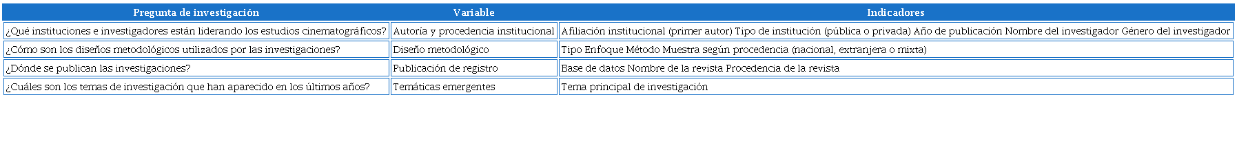 El trabajo de Bedoya, además de detener su revisión en el año 2016, tuvo como objetivo publicaciones en formatos tradicionales (libros en su mayoría) sin tomar en cuenta el trabajo de investigación presente en bases de datos académicas como Scopus, Web of Science, Scielo, Proquest, etc., espacios que han ganado terreno en la difusión de trabajos académicos sobre cine en los últimos años. Por ello, realmente no se tiene un panorama completo de las investigaciones vinculadas al cine en el Perú, y los datos sobre sus objetos de estudio, sus autores o diseños metodológicos siguen sin explorarse. Por estas razones resulta urgente actualizar dicho panorama, incorporando los estudios cinematográficos llevados a cabo desde entornos de educación superior en cine y comunicación audiovisual en lo que va del siglo XXI. Así como Cerdán y FernándezLabayen (2020) han hablado de iniciativas que buscan “dar visibilidad a las rutas industriales del cine iberoamericano en el contexto histórico contemporáneo” (p. 497), este artículo busca exponer el trabajo de docenas de investigadores e investigadoras del ámbito cinematográfico que, igual que sus contrapartes en el mundo de la realización, siguen luchando por el acceso a espacios de difusión. Se parte de las siguientes preguntas de investigación: (1) ¿qué instituciones e investigadores están liderando los estudios cinematográficos?, (2) ¿cómo son los diseños metodológicos utilizados por las investigaciones?, (3) ¿dónde se publican las investigaciones?, y (4) ¿cuáles son los temas de investigación que han aparecido en los últimos años?