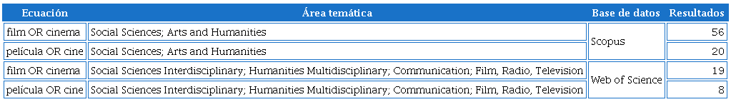Tomando en cuenta los orígenes académicos de los Estudio Fílmicos, la búsqueda se realizó en las áreas temáticas de Social Sciences y Arts and Humanities de Scopus, y Social Sciences Interdisciplinary, Humanities Multidisciplinary, Communication y Film, Radio, Television en el caso de Web of Science. La recuperación de registros se desarrolló entre abril y mayo de 2024. Los resultados iniciales de la búsqueda pueden consultarse en la Tabla 3.
