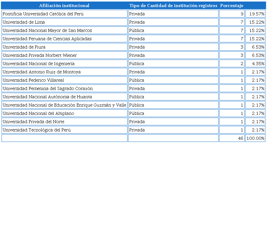 Para este indicador se consideró únicamente la afiliación del primer autor del estudio (ver Tabla 4). Se tiene 9 investigaciones provenientes de la Pontificia Universidad Católica del Perú (19.57%), institución que es seguida por la Universidad de Lima (15.22%), la Universidad Nacional Mayor de San Marcos (15.22%), y la Universidad Peruana de Ciencias Aplicadas (15.22%), cada una con 7 investigaciones como primera afiliación. Es decir, el 65.23% del total de la producción está concentrado en 4 instituciones, todas con su sede principal en la capital peruana. Se detectan instituciones como la Universidad de Piura (6.53%), la Universidad Privada Norbert Wiener (6.53%), cada una con 3 investigaciones, y la Universidad Nacional de Ingeniería (4.35%) que tiene 2. Las instituciones restantes poseen un solo artículo científico cada una.