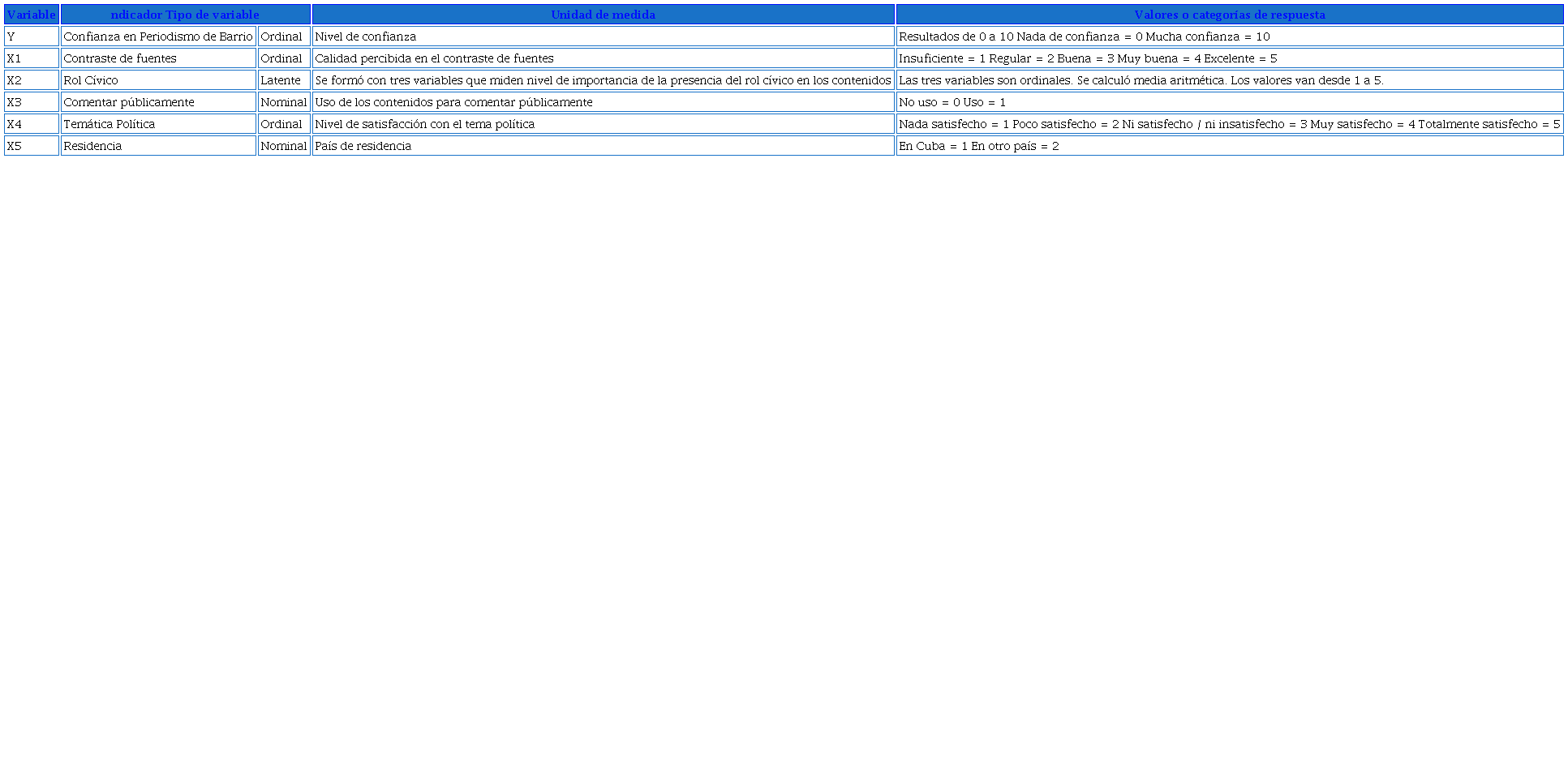 El tipo de variable, su unidad de medida y valores se describen en la Tabla 1.