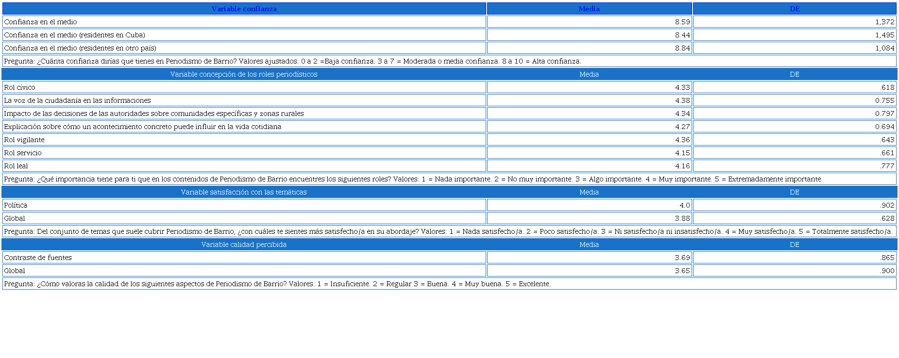 Por tanto, estos resultados parecen indicar que la audiencia incrementa su confianza en Periodismo de Barrio al encontrar un abordaje alternativo, sobre todo al de los medios estatales cubanos, en torno a los sucesos políticos que tienen lugar en el país. Este comportamiento se corrobora con las respuestas a una pregunta incluida en el cuestionario, que indagaba sobre los medios más frecuentemente consultados por las personas participantes (escala con valores 1 al 5). Estos resultaron ser los de otros países (M= 3.93; DE= .89) y los independientes cubanos (M= 3.84; DE= 1.01).