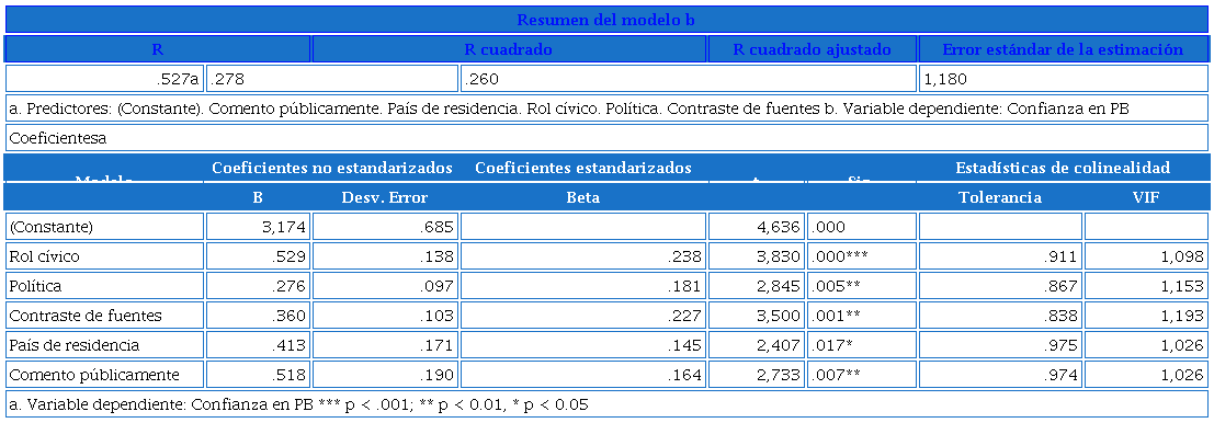 Para comprobar la hipótesis se aplicó una regresión lineal sustentada en un modelo de regresión múltiple, que toma como variable dependiente (VD): la confianza en Periodismo de Barrio; como variable independiente (VI) los indicadores: percepción sobre el contraste de fuentes, rol cívico, comentar públicamente, temática política; y como variable de control (VC): residencia.