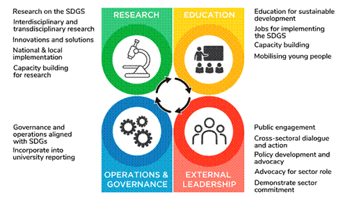 The four levers that enable universities to develop the SDGs and thus contribute to the UN goals (Figure 1) are research, education, management and governance model, and social leadership. The SDGs provide an opportunity to link these dimensions, which together enable universities to contribute to the development of these goals (SDSN, 2017).