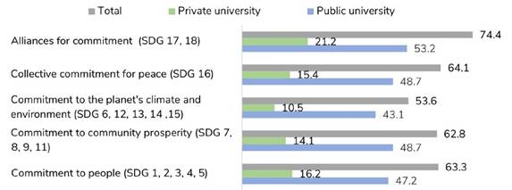 Taking into account the areas established by the UN in the development of the 2030 Agenda, the analysis reveals that actions referring to Alliances for Commitment have a greater presence than the rest (74.4%), followed by Collective Commitment for Peace (64.1%), Commitment to People (63.3%) and Community Prosperity (62.8%), with actions of Commitment to the Planet’s Climate and Environment coming last (53.6%). While Alliances is the most developed dimension for public and private universities, the second most developed dimension is Collective Commitment for Peace and Community Prosperity in public universities, and Commitment to People in private universities (Graph 3).