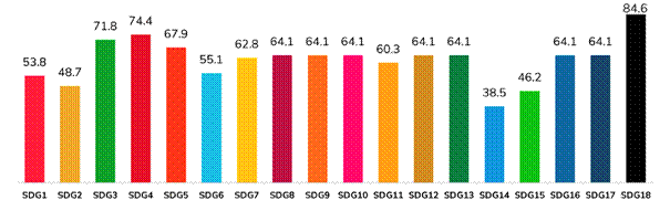 The 2030 Agenda is mentioned in 82% of the social responsibility or sustainability reports and even in some strategic plans. However, the analysis of official websites shows that universities contribute to the achievement of the different SDGs in different proportions (Graph 1), with Quality Education (SDG4) standing out with a presence of 74.4%, Health and Well-being (SDG3) in 71.8% of universities and Gender Equality (SDG5) in 67.9%.