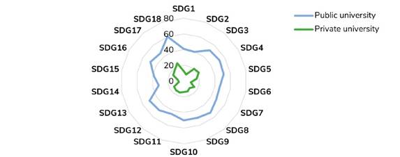 The data (Graph 2) shows that SDG4 Quality Education and SDG8 Decent Work and Economic Growth are the most developed by public universities, while in private universities, SDG4 Quality Education is in first place SDG3 Health and Well-being and SDG5 Gender Equality are tied for second place in public universities. In the private sector, however, SDG3 Health and Well-being is in second place. SDG12 Sustainable Consumption and Production and SDG16 Peace, Justice and Strong Institutions rank third in public universities, and SDG17 Partnerships to Achieve Goals in private universities. It should be noted that SDG2 Zero Hunger is the least developed in both public and private universities, and SDG6 Clean Water and Sanitation also appears in last place in private universities.