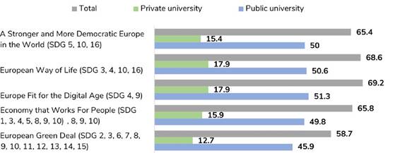 The analysis of the actions according to the priority areas of the European Commission’s SDGs shows that almost 70% contribute to sustainable development. A Europe Fit for the Digital Age accounts for 69.2%, the European Way of Life 68.6%, while an Economy that Works for People 65.8% and A Stronger and More Democratic Europe 65.4%, with the European Green Pact being the area with the lowest weight (58.7%). The cross-analysis shows that the contribution of universities to these priority areas does not differ between types of universities (Graph 4).