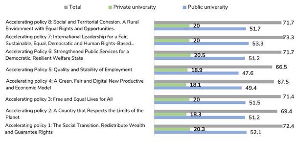 From the perspective of the Sustainable Development Strategy (Graph 5), the majority of universities focus on actions that contribute to policy 7: International Leadership for a Fair, Sustainable, Equal, Democratic and Human Rights-Based Globalization (73.7%); policy 1: The social transition. Redistribute Wealth and Guarantee Rights (72.4%); with the same frequency, policy 6: Strengthened Public Services for a Democratic and Resilient Welfare State ; and policy 8: Social and Territorial Cohesion. A Rural Environment with Equal Rights and Opportunities (71.7%). The contribution of universities to the rest of the strategic axes appears in 66%, and 71% are in policy 2: A Country that Respects the Limits of the Planet; policy 3: Free and Equal Lives for All; policy 4: A Green, Fair and Digital New Productive and Economic Model; and policy 5: Quality and Stability of Employment .