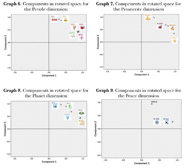The correlation matrix for People shows some values below 0.30 with a determinant equal to zero, so the variables (SDGs) are probably independent and the PFA is not applicable for this dimension. Nevertheless, the correlations between the variables that compose the Prosperity dimension, the variables of the Planet dimension and the variables of the Peace dimension are above 0.30 and their determinants are low but non-zero. The Kaiser-Meyer-Olkin (KMO) Measure of Sampling Adequacy and Barlett’s Test of Sphericity reinforce the high correlation between their variables (ODS). Visually, the interrelationship between the variables can be appreciated with the rotated space component plots for the four dimensions (Graphs 6, 7, 8 and 9).