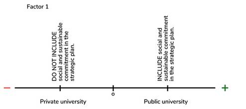 In order to determine whether there is an interdependent relationship between the categories of ownership type and strategic social and sustainable commitment, a simple correspondence analysis was performed. The Chi-square value (X21 = 16.090) with a significance level of p = .000 indicates that the variables are associated, and the factor analysis indicates that the first factor explains 100% of this association. By columns, the private university category is higher than the average inertia, explaining 64.1% of the association. Thus, private ownership tends not to include social and sustainable commitment in its strategic plans. By ranks, the category ‘does not include social and sustainable commitment in the strategic plan’ explains 83.3% of the association between the categories. The analysis reveals that the universities that include social and sustainable commitment in the strategic plan are those with public ownership (Figure 2).