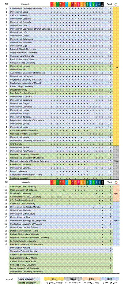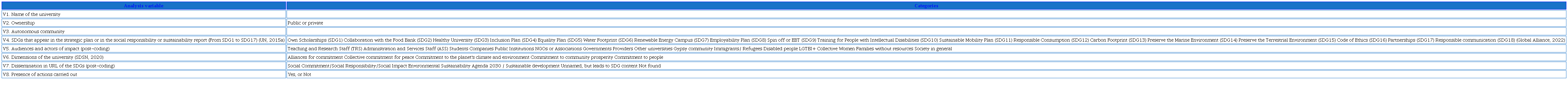 The research method used is the content analysis of both digital documents or web information, following the methodology of Carretón-Ballester, Quiles-Soler and Lorenzo-Solá (2023), and of the specific sites on sustainable development for the 2030 Agenda of the official websites of the universities. The presence of the 17 UN Sustainable Development Goals is analyzed, as well as the actions developed in each of them. To measure the dissemination of the SDGs through a specific site on the university’s official website, SDG 18 (Responsible Communication) proposed by the Global Alliance for Public Relations and Communication Management to be included in the goals of the 2030 Agenda (Carretón-Ballester, Quiles-Soler & Lorenzo-Solá, 2023), is included in the analysis. Then, in March 2024, the information related to social responsibility reports, Strategic Plan, Equality Plan or Inlcusion Plan was consulted among the Times Higher Education indicators to verify that we had analyzed all the reports.