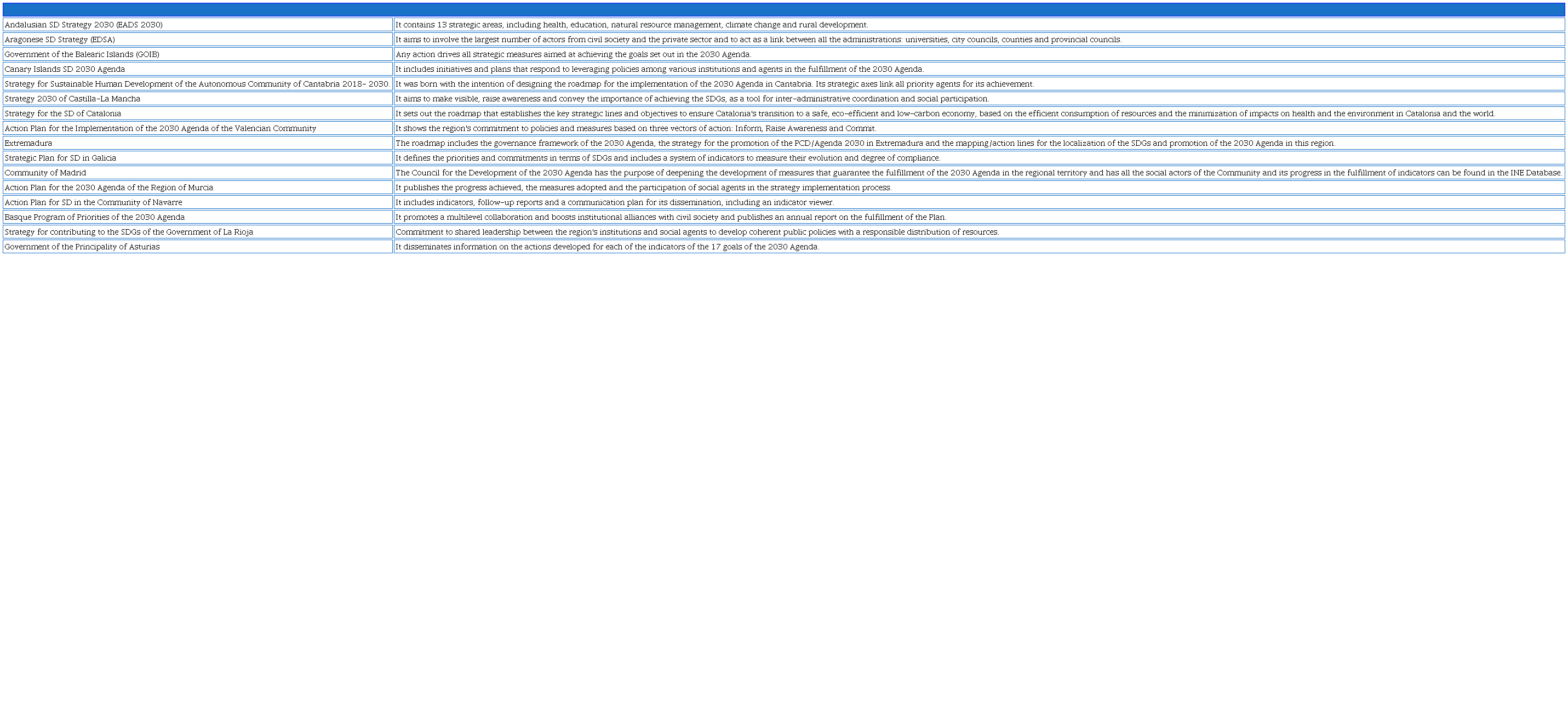 The 2030 Agenda Action Plan (Gobierno de España, 2018) and the 2022 Progress Report of the Government of Spain’s Sustainable Development Strategy (Ministerio de Derechos Sociales y Agenda 2030, 2022) include the involvement of substate governments (Table1). The strategy, policies, plans and actions with updated information on each of them can be consulted on their websites.