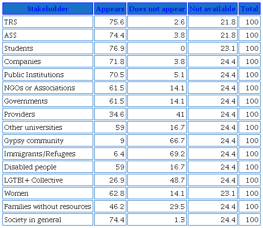 University responsibility is embedded in the majority of academic institutions. The analysis indicates that social and sustainable commitment is included in 83% of strategic plans, especially in public universities, compared to 17% of universities that do not yet include it as a strategic line. In addition, University Social Responsibility (USR) or sustainability reports and official websites include the university’s contribution to the achievement of the Sustainable Development Goals in almost 77% of universities.