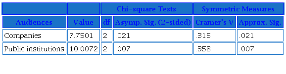 The statistical analysis is robust and shows a statistically significant relationship between university ownership and certain audiences (Table 6). Companies and public institutions are found more in public universities reports with a statistically significant, albeit moderate-low relationship. Therefore, the null hypothesis of independence is rejected, and it is concluded that the presence of private companies and public institutions in the reports depends on the type of university ownership.