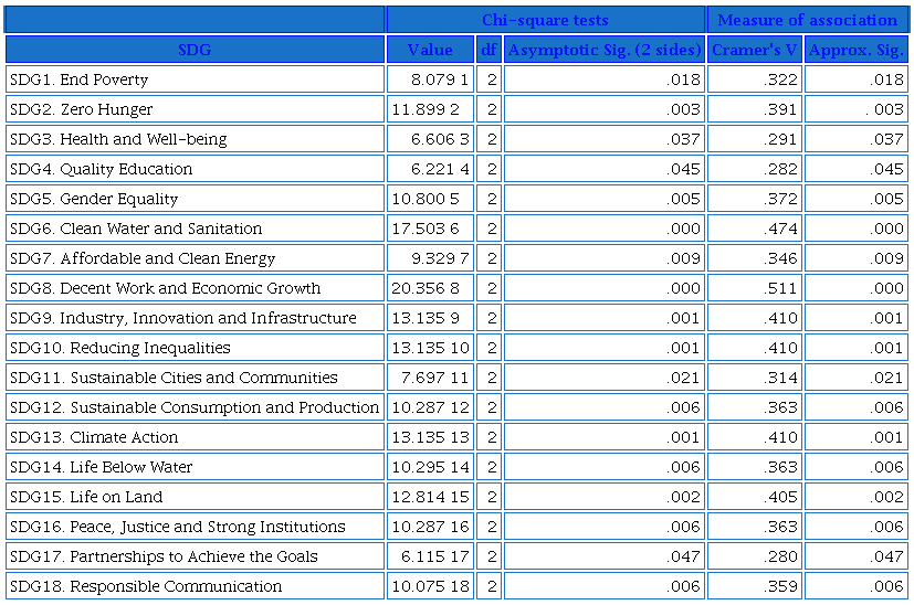 Based on the results of the contingency table, we ask whether public or private ownership determines how universities contribute to each of the SDGs, so we pose the null hypothesis of independence between the type of university (public or private) and each SDG. The Chi-Square test (Table 4) is calculated and reveals that, with a confidence level of 95%, there is a statistically significant relationship between tenure and the development of the Sustainable Development Goals in the university, being, therefore, dependent variables. Thus, it can be affirmed that the SDGs are developed more in public universities than in private universities.