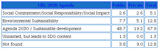 In conclusion, although it is possible to observe the contribution of universities to the SDGs and their degree of involvement according to their public or private nature, as well as their focus on certain SDGs to the detriment of others, the way in which this is communicated (difficult accessibility on the web) makes it difficult to know actions being carried out and the progress in their development. In this sense, our research highlights the shortcomings in the dissemination of the SDGs by universities. Toro-Peña (2020) previously pointed out the reduced conception of communication given to the SDGs and Mulholland, Bernardo and Berger (2017) noted that neither the 2030 Agenda nor the SDGs themselves make express reference to their communication, despite the fact that it is an essential tool not only for their dissemination, but also for their knowledge and implementation among the population (Díaz-Bordenave, 1998).
