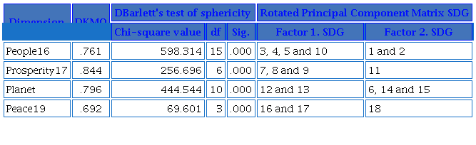 Based on this analysis, the question arises whether this interdependence is replicated in each of the dimensions: People (SDGs 1, 2, 3, 4, 5 and 10), Prosperity (SDGs 7, 8, 9 and 11), Planet (SDGs 6, 12, 13, 14 and 15) and Peace (SDGs 16, 17 and 18). To this end, an exploratory factor analysis (EFA) was performed for each of them (Table 9).