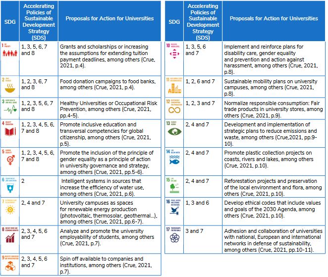 To this end, the proposals for action of the CRUE Universities 2030 Agenda Commission for each of the SDGs would contribute to the implementation of these eight strategic axes (Table 3).