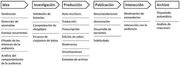 Resulta interesante la aportación de Noaim-Sánchez (2023) realizada a partir de entrevistas con profesionales de la información de diferentes países. En los resultados de su trabajo se explicitan ciertas funciones del uso de la IA: generación de contenido a partir de datos estructurados como resultados deportivos, informes financieros y previsiones meteorológicas; personalización de contenido; análisis de audiencia; verificación de datos; detección de comentarios tóxicos; transcripción automática de audio a texto; identificación de locutores; y la generación de metadatos.