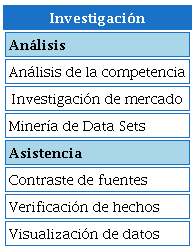 La fase de investigación suele estar muy vinculada a la de ideación: hay procesos compartidos que iteran entre sí y a veces es difícil determinar en cuál de estas dos fases ubicarlos. El criterio que hemos seguido para determinar que un proceso forma parte de la fase de investigación es que los datos o la información con la que se trabaja haga referencia a elementos externos a la propia empresa. En esta fase, nuevamente, destacan las funciones de análisis, como las relacionadas con la investigación de mercado, el análisis de la competencia o la minería de datos. También destacan las funciones de asistencia, como la visualización de datos, el contraste de fuentes o la verificación de hechos (Tabla 2).