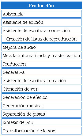 La fase de producción ha sido el centro de interés de los desarrolladores en el momento de idear soluciones IA para la industria. Es donde se concentra un mayor número de posibilidades, tanto de asistencia como generativas. A esta etapa pertenecen las funciones de asistencia relacionadas con la traducción de textos, la creación de listas de reproducción, la mejora de la calidad de los archivos sonoros, los asistentes de edición o la mezcla automatizada y la masterización. Encontramos aquí funciones generativas como la síntesis, la clonación o la transformación de voz, la generación musical o de efectos y la separación de pistas. Los asistentes de escritura, puesto que pueden servir tanto para la corrección de textos como para su creación, pueden catalogarse tanto como IA de asistencia y como IA generativas (Tabla 3).