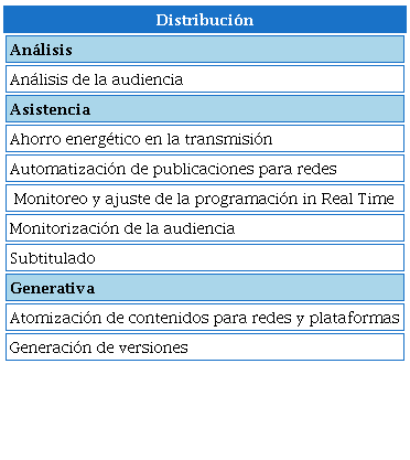 En la etapa de la distribución, aunque priman las funciones de asistencia, encontramos también de análisis, destinadas a realizar análisis de audiencia, y de generación, como las que crean versiones o las que atomizan los contenidos para distribuirlos en diferentes soportes y plataformas (Tabla 4). No obstante, las principales son las de monitorización de la audiencia, las de ajuste de la programación en tiempo real, las funciones técnicas de ahorro energético en la transmisión, el subtitulado automático o la automatización en la publicación para redes sociales.