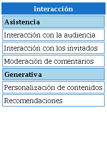 Hemos agrupado en la fase de interacción funciones de asistencia relacionadas con la moderación de comentarios en redes sociales, la interacción con la audiencia y con los invitados, así como desarrollos generativos, como la creación de recomendaciones y sugerencias o la personalización de contenidos (Tabla 5).
