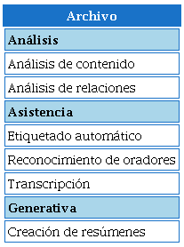 También Fernández (2023) propone funciones que pueden aplicarse en el tratamiento del sonido. Las concreta en cinco funciones: conversión de voz a texto (transcripción), traducción de transcripciones, reconocimiento y etiquetado de oradores, extracción e indexación de palabras clave y reconocimiento y etiquetado de efectos sonoros.