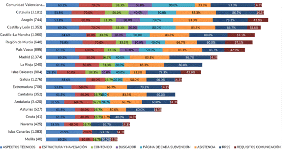 A modo de resumen, Madrid (86,7%), Cataluña (86,7%) y Comunidad Valenciana (93,3%) son las comunidades con un desempeño más optimo en esta sección. Por el contrario, Melilla (20%) y País Vasco (46,7%) son las que obtienen una peor valoración.