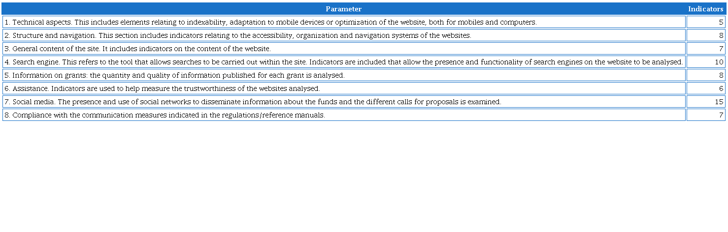 Tras conformar el protocolo se procedió a su validación mediante el método de juicio de expertos (Escobar-Pérez & Cuervo-Martínez, 2008) y la versión definitiva quedó compuesta por ocho parámetros y 66 indicadores (tabla 1). En concreto, se pasó a cuatro expertos, dos especialistas en comunicación y dos especialistas en ayudas en I+D+i