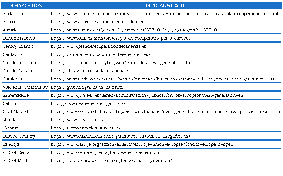 Sin embargo, al igual que ocurría con el reparto entre los estados miembros, la distribución del presupuesto por CCAA también está siendo dispar. Según datos del Ministerio, a fecha de 16 de marzo de 2023 se han asignado a las comunidades autónomas 21.609 M€, siendo Andalucía (3.420), Cataluña (3.181), Madrid (2.374), Comunidad Valenciana (2.060), Castilla y León (1.353) Galicia (1.276) y Castilla-La Mancha (1.060) las demarcaciones que más fondos han movilizado (Gobierno de España, 2023).