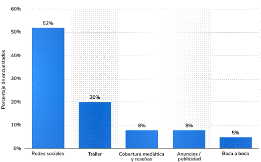 Del ranking 2 al 9 son historias centradas en el género masculino con representaciones estereotipadas del héroe y el líder como se puede apreciar en la tabla 3. Según una encuesta online realizada por Statista (2023) a 1,677 personas a nivel mundial, reveló que el 52% de los encuestados obtuvo información previa sobre la película a través de las redes sociales (Figura 1), destacando el impacto de la estrategia de marketing digital implementada por Warner Bros y Mattel.