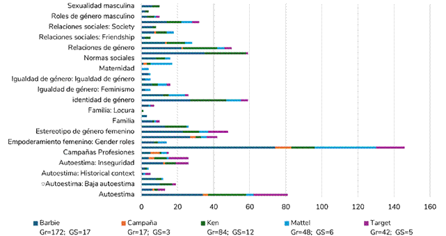 Barbie cuenta con 411 citas, 172 (Gr) enraizamiento de códigos que indica el número de citas codificadas por el código en los que se encuentra está voz y 17 (GS) documentos, de los cuales los códigos con más prevalencia son: Empoderamiento femenino (74), Patriarcado (35), Autoestima (34), Empoderamiento femenino: self-expression (27) e identidad de género (27).