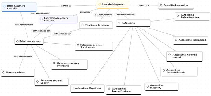 En la red de relaciones de la categoría masculinidad (figura 5), se encuentra que el eje es identidad de género y de este código hacen parte o tienen una proximidad roles de género masculino, estereotipo de género y sexualidad masculinos. La autoestima es una propiedad de la identidad de género y relaciones de género tiene una relación por asociación con identidad de género.