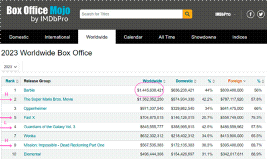 Como muestra la tabla 3, el impacto del primer lugar en taquilla se presenta por la competencia a la que se enfrentó. The Super Mario Bros. Movie, un ícono de los videojuegos; Oppenheimer la gran ganadora de The 96th Academy Awards 2024; Guardians of the Galaxy Vol. 3, Fast X, SpiderMan: Across the Spider-Verse, Mission Impossible - Dead Reckoning Part One, son largometrajes que hacen parte de sagas y franquicias que se han asegurado seguidores por la trayectoria que han ido ganando a lo largo del tiempo.
