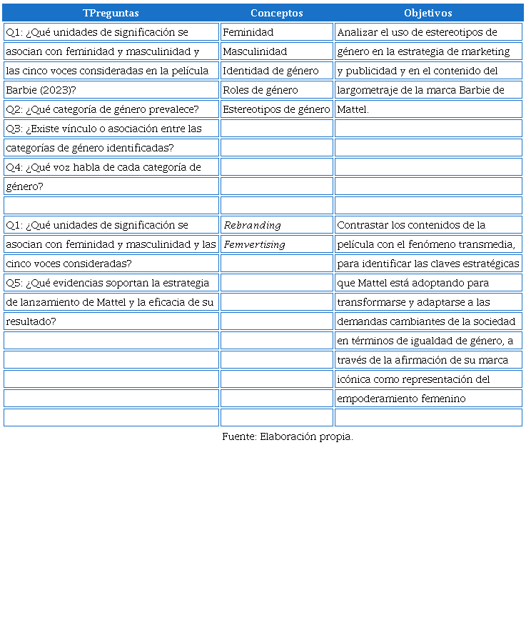 El diseño metodológico se estructuró en dos momentos: (1) la recopilación de datos publicitarios y promocionales de Barbie en 2023, así como información sobre las iniciativas de Mattel relacionadas con la campaña You Can Be Anything, y (2) el análisis de contenidos, en el que se sistematizaron y clasificaron las escenas según temas y voces (ver tabla 2).