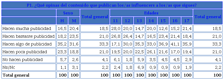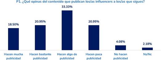 Los resultados indican que el 39,4% de adolescentes considera bastante o mucho el volumen de publicidad sobre alimentación y cuidado del cuerpo que suelen publicar los influencers entre su contenido. Sin embargo, el 54,28% de ellos considera que publican algo o poca publicidad sobre estos tópicos entre su contenido. Este resultado indicaría que la mayoría de adolescentes tiene ciertas dificultades para reconocer la publicidad de alimentación y cuidado del cuerpo en el contenido de los influencers.