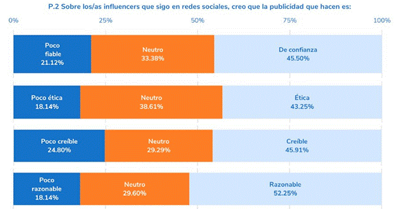 Se percibe como razonable (52,25%), creíble (45,91%), ético (43,25%) y de confianza (45,50%). Los resultados son significativamente más altos que estudios previos (Feijoo, et al., 2023). Lo que sugiere que el adolescente peruano se fía más de la publicidad del influencer sobre cuerpo y dieta que el español. Esto puede deberse al incipiente desarrollo del campo en Perú, comparado con España. Estos niveles unidos a las dificultades para reconocer la publicidad cuando no es señalizada (Evans et al., 2017; Feijoo et al., 2021; Zozaya Durazo et al., 2022; Zozaya-Durazo y Sádaba-Chalezquer, 2022) sugieren un riesgo para el adolescente, pues afectan su sensibilidad para adoptar una actitud más crítica a la publicidad, causando exceso de confianza. Esto sugieren que la percepción del adolescente está influida por la relación parasocial (Conde y Casais, 2023; Du et al., 2023; Rosengren y Campbell, 2021; Um, 2023) o trans-parasocial (Lou, 2022), que lo lleva a percibir al influencer como alguien cercano y aval creíble (Janssen et al., 2022).