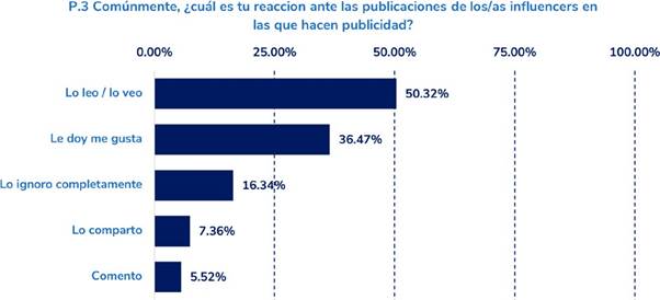 Sobre el tercer objetivo, los resultados sugieren que la favorable respuesta a la publicidad so- bre alimentación y cuidado del cuerpo por parte del adolescente redunda en una actitud más receptiva a estos contenidos, lo que se manifiesta en su disposición a ver y leer (50,32%) y a darle “me gusta” (36,47%) a estos contenidos, lo que indica que la receptividad es mayor que la interacción. Sin embargo, los resultados son congruentes con la literatura, que destaca la mayor apertura al influencer advertising, respecto del marketing tradicional (Kim y Kim, 2021; Martins et al., 2023; Rosengren y Campbell, 2021) y la mayor disposición a interactuar con este contenido y amplificarlo (Evans et al., 2017; Gross et al., 2023; Kim y Kim, 2021). El análisis de dependencias indica que existe dependencia entre el sexo y la apertura a interactuar con “Me gusta”, las diferencias por edad indican que las mujeres tienen a interactuar más con este contenido a través del “me gusta”. Esto es consistente con estudios previos que indican mayor influencia en las mujeres a interactuar con el contenido persuasivo (Bajaña Marí García, 2023; García Puertas, 2020; Lozano-Muñoz et al., 2022).