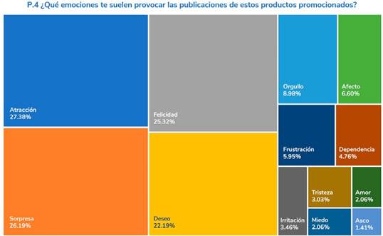 La publicidad sobre alimentación y cuidado del cuerpo publicado por los influencers en RS evoca en el adolescente múltiples emociones (Figura 5). Sin embargo, destacan, por encima de otras: atracción (27,38%), sorpresa (26,19%), felicidad (25,32%) y deseo (22,19%). Mientras que, las emociones que menos presencia son: asco (1,41%), amor (2.06%), miedo (2.06%), tristeza (3.03%) e irritación (3.46%). Los resultados indican que esta publicidad evoca en el adolescente, principalmente, emociones positivas relacionadas con la deseabilidad y adquisición de un bien o servicio, mientras que la presencia de emociones negativas es significativamente menor.