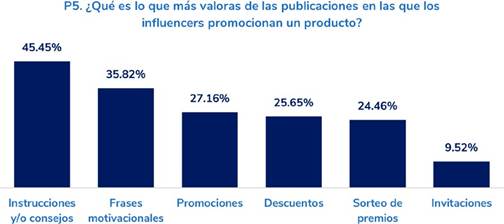 La Figura 6 muestra lo más valorado por el adolescente de la publicidad sobre alimentación y cuidado del cuerpo publicado por los influencers. Entre los aspectos más valorados por el adolescente figuran: las instrucciones y/o consejos (45,45%), las frases motivacionales (35,82%), promociones (27,16%) y descuentos (25,65%). Siendo lo menos valorado el sorteo de premios (24,46%) y las invitaciones (9,52%).