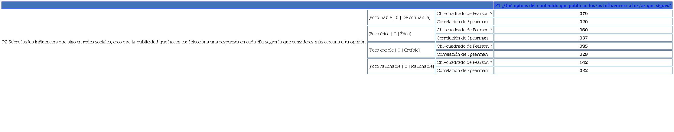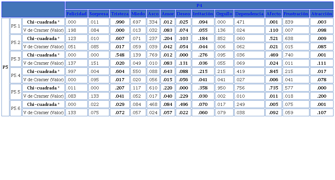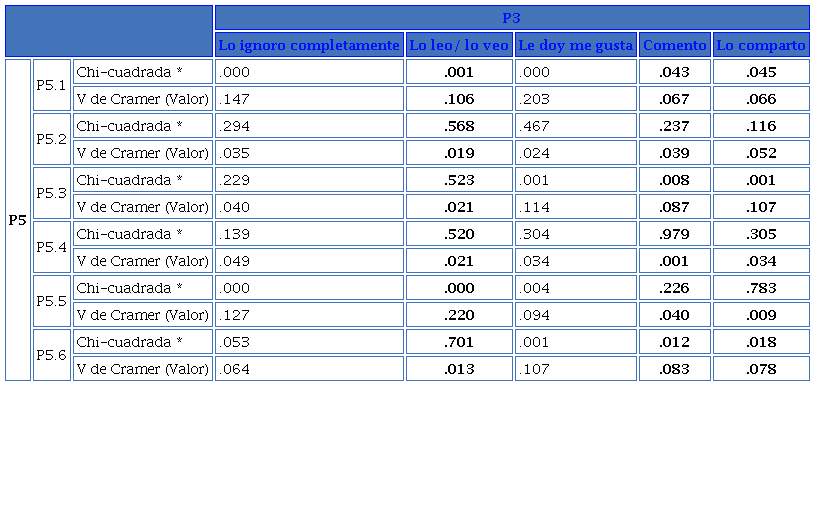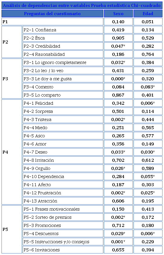 La segunda se analizó en la pregunta dos (P2), y se midió con una escala ordinal para evaluar la fiabilidad, ética, credibilidad y razonabilidad. La tercera se estudió en la pregunta tres (P3) y se midió con seis categorías nominales. La cuarta se analizó en la pregunta cuatro (P4) y se midió con un listado de catorce emociones. La quinta variable se estudió en la pregunta cinco (P5) y se midió con siete variables nominales. Para estas cinco variables se analizó la dependencia por sexo y edad mediante la prueba Chi-cuadrado. Finalmente, la variable seis se evaluó con un análisis de asociación mediante las pruebas Chi-cuadrado y correlación de Spearman. La últi- ma variable se examinó con un análisis de asociación y se emplearon las pruebas Chi-cuadrado y V de Cramer.