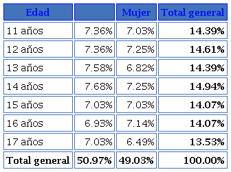 La población se estimó con el padrón web de RENIEC, que brinda información de todos los ciudadanos peruanos con DNI. Con esos datos se determinó, en septiembre de 2023, que la población está constituida por más de 4,2 millones de hombres y mujeres de 11 a 17 años de Perú urbano. Luego se realizó el muestreo, polietápico, estratificado y con afijación proporcional. En la estratificación se usaron los estratos departamentos de Perú, edad y sexo. Esto dio a conocer la composición de la población según los estratos. Con los resultados se calculó el tamaño de muestra, que ascendió a 1020 unidades de análisis con un nivel de confianza de 95% y un margen de error de +/- 3%. Finalmente, la estratificación se usó para la afijación proporcional de la muestra, de modo que, la muestra tenga la misma composición de la población del estudio. La Tabla 1 presenta la composición de la muestra por sexo y edad, no incluye los departamentos pues no resulta relevante para el análisis de resultados.