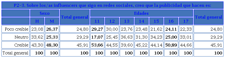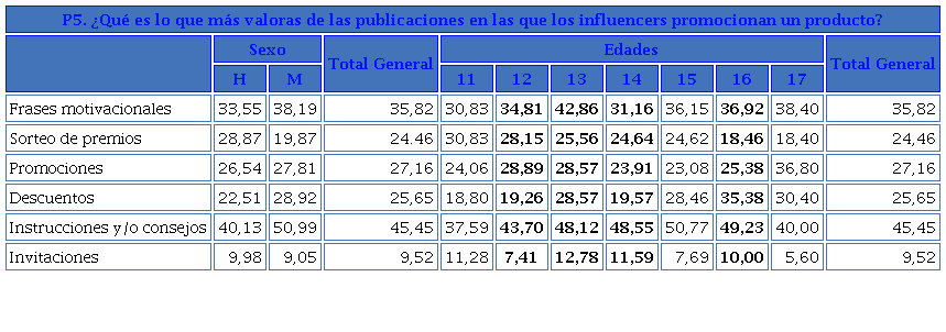 OE3. Conocer los aspectos más valorados por el adolescente, por sexo y edad, de la publicidad sobre alimentación y cuidado del cuerpo que recibe de los influencers que siguen en RS.