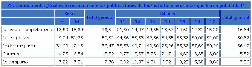 OE4. Conocer la actitud y comportamiento del adolescente, por sexo y edad, a la publicidad sobre alimentación y cuidado del cuerpo que publican los influencers que siguen en RS.