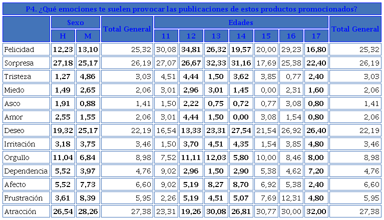 OE8. Conocer la relación entre los aspectos más valorados de la publicidad sobre alimentación y cuidado del cuerpo y la respuesta emocional de parte del adolescente.