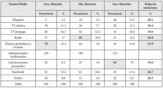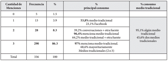 En segundo lugar y dentro del orden de prioridad en materia de preferencias de consumo -menciones-, en la Tabla 2 se observa nuevamente que dos medios “tradicionales” como prensa y radio son los más utilizados en la primera y segunda mención. En contraste, la categoría “conversaciones personales” se advierte mayoritaria sólo en la tercera mención. Al considerar todas las menciones (respuestas múltiples) correspondientes a la totalidad de los casos (N =336), se confirma una mayor presencia de la prensa y la radio acompañadas por la red social Facebook.
