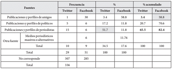 En el caso de medios/fuentes no tradicionales como Facebook (N =51) y Twitter (N= 29), que también han sido elegidos como prioritarios (primera mención) para acceder a información política, considerar la amplitud de la dieta permite aproximarnos a conocer qué perfiles específicamente se constituyen en fuentes cotidianas de información política. Al respecto, en la Tabla 3 se observan diferencias entre ambas redes sociales: mientras Twitter emerge como el medio para acceder a fuentes periodísticas (51,7%), Facebook aparece asociado mayoritariamente (58,8%) a las amistades personales como fuentes informativas.